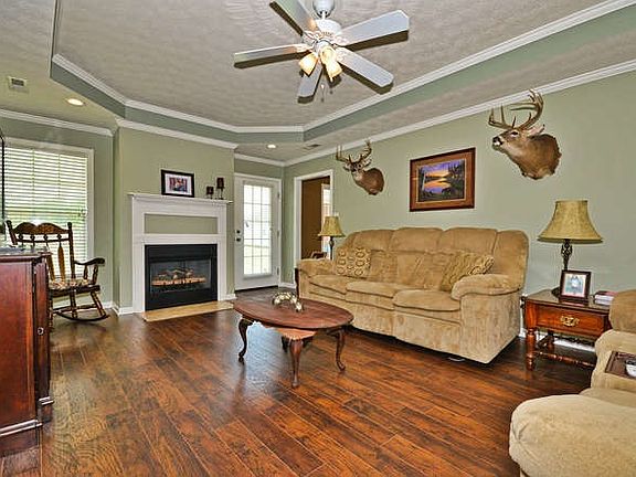 - LIVING ROOM DESC: Fireplace, Crown Mold, Wood Floor, Ceiling Fan, Recessed Lighting