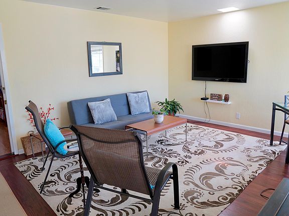 3 bedroom / 2 bath home in Castro Valley, with attached studio/separate entrance. Available furnished or unfurnished with one year lease. 3 month lease avail. furnished only. Original hardwood floors throughout *pergo in kitchen. Master bedroom with coffer ceiling/light and large windows, remodeled bathroom with large shower, central heating and air with many windows for circulation. Many cabinets in great room for storage. Living room that leads to kitchen-dining, vaulted great room. Pocket door to separate living/great room for privacy. Large back deck, with fully fenced back yard, concrete area for grilling, majestic redwood and apple tree. Great entertaining space. Includes 8x10 storage shed. Studio entry through kitchen or laundry room. New shower/bathroom with folding desk, cabinets, blackout curtains. Great sleeping room with smart tv mount. Large window for circulation. Great location with equal distance to San Francisco, Walnut Creek and San Jose. Bart is a short 8 minute walk. Please have verifiable income and past rental history. Small Dog Allowed with $2500 deposit. We look forward to hearing from you. Jen Owner pays for trash and sewer