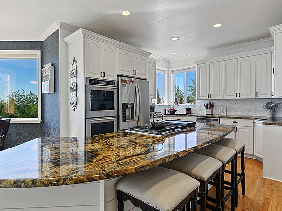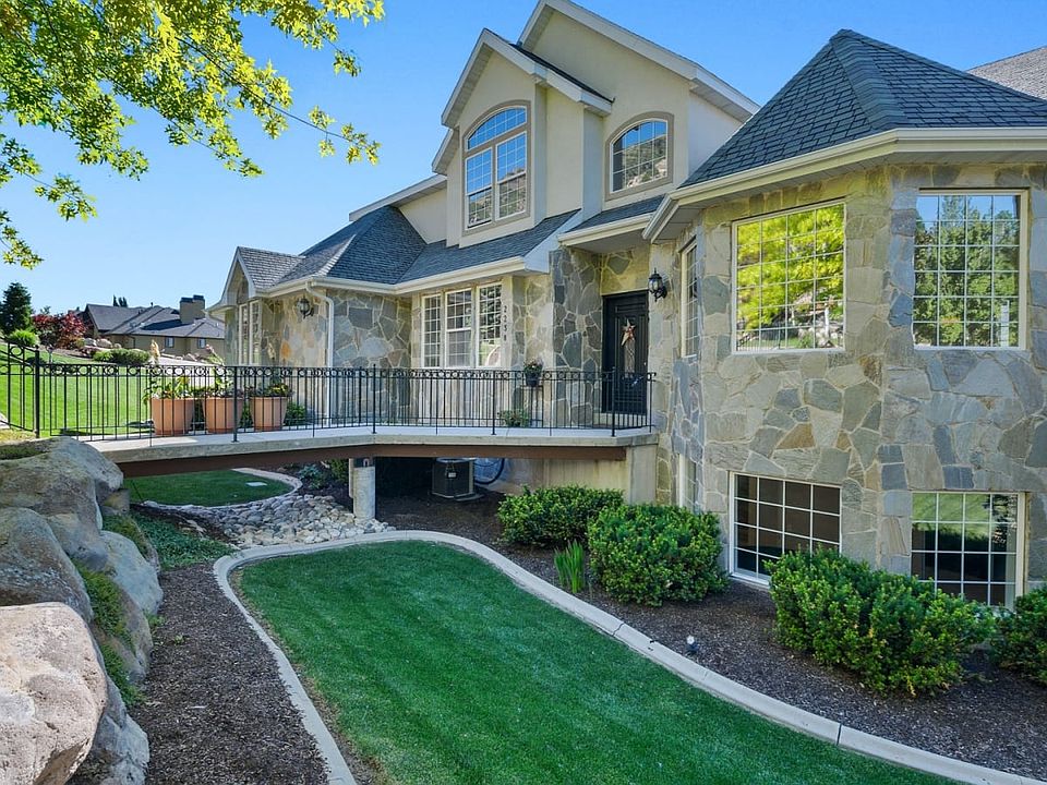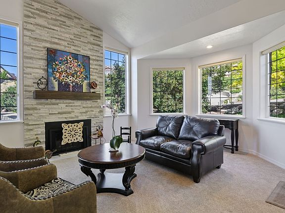 A spectacular view from every window awaits you in this Draper bench dream home. Dramatic vaulted ceilings are throughout the six-bedroom, 4 1/2 bath home. The gourmet kitchen, breakfast nook and spacious deck are delightful. The huge master bedroom has a windowed sitting area and a huge walk-in closet. The yard is immaculately landscaped with a waterfall and wrought iron fence enclosing the whole yard. A three-car and detached two-car garages provide plenty of space for your toys.