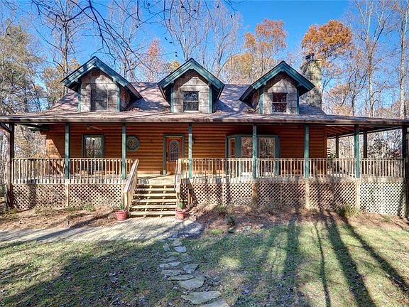 Incredible LOG CABIN nestled on serene 14AC. Property features PAVER DRIVEWAY, large WRAP-AROUND PORCH, and PATIO overlooking the creek. Recently resealed & reconditioned Western Red Cedar Logs and NEW ROOF. HW floors, updated kitchen with Hickory cabinets, solid-surface counters, SS appliances including double oven. ML BR w/ attached Bath. Master with BUILT-INS, CUSTOM WALK-IN CLOSET, DBL Vanity and PRIVATE BALCONY. BASEMENT with OFFICE & FULL BATH has private entry & 2-Car GARAGE w/ WORKSHOP.