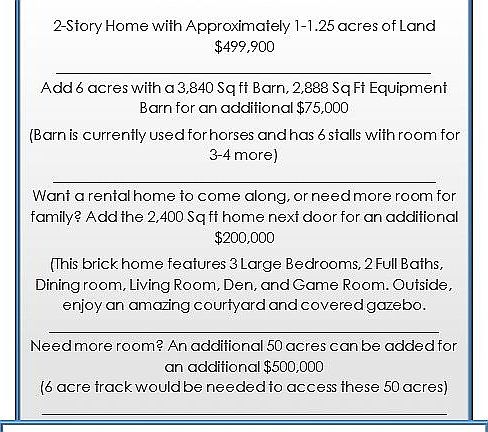 Please see photos 1 and 2 for more details... Purchase 1 House, 2 Homes, 6 acres or 57 acres. Many opportunities available with this property. Main Home has extra large rooms, 4 Bedroom + an Office. Walk In-Closets, 3.5 baths, Large Laundry room, separate cleaning closet, laundry chute, built in bar, sun room and so much more. Hot Tub room off the master that goes out to the pool is great on cold nights or to relax after a long day. Kids bathroom upstairs has a stand alone shower and a separate tub/shower combo. Laundry Chute located in kids walk-in closet with built in dressers. Pool has a brand new pump system. Outdoor Kitchen area and covered gazebo. 2nd home available for purchase is located next door and great for rental income or family. This home is 2400+sq feet brick home with 3 Bedrooms, 2 Bath, Living Room, Separate Den, Dining, spacious kitchen, and game/party room. Backyard courtyard is a gardeners dream! All windows were replaced 6mths ago. Add the acreage for access to the 2888 sq ft equipment barn and 3840 sq ft horse barn featuring 6 stalls with room for 3-4 more. Hot Walker and Round Pen can remain. Fenced acreage for horses. Don't miss the great price for all these amenities. (Prices for 2nd home, and extra land listed on photo #2)