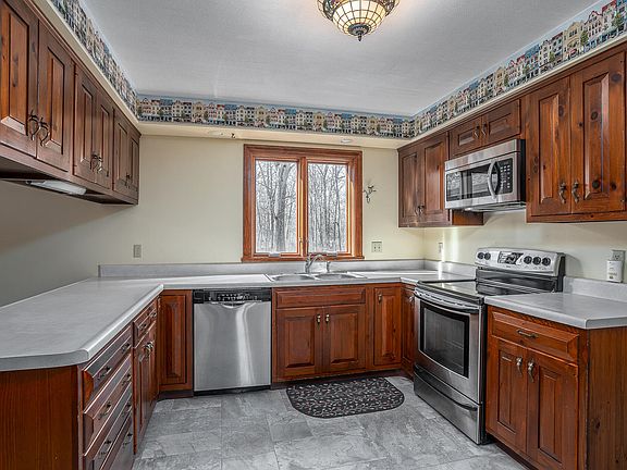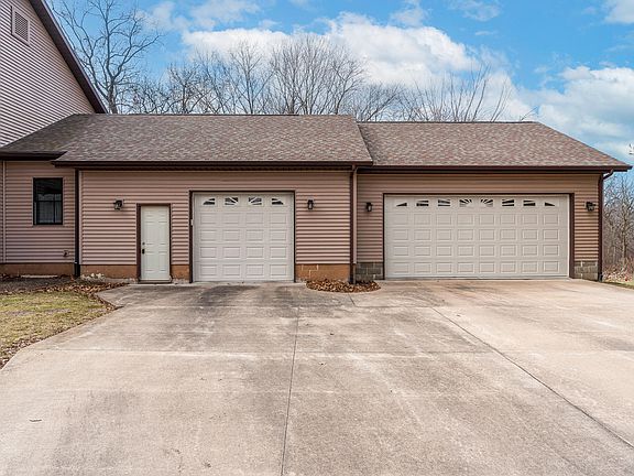 Comfortable well built and well maintained 2 story in a wooded setting just west of town. Spacious living room and dining room. 3 bedrooms, and 3 baths (one being a jack and jill) on second floor. 2 fireplaces both wood burning. Well appointed kitchen, appliances could stay. Main floor laundry room with convenient half bath. Huge 3 stall garage that could accommodate 4 cars. Large basement area with lots of potential for more living area. Recent mechanicals. Low maintenance exterior. Check this one out today.