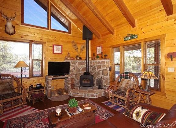 This is what Colorado living is all about! From the covered wrap around front porch you can over see the manicured 4 acres of meadow and partially treed. Beyond that the most spectacular views of the Sangre de Cristo mountain range from one end to the other. This well crafted home offers main level living with large vaulted ceilings. The great room (living room/ dining room) has wood stove with moss rock hearth and surround. The walls and ceilings are vaulted Aspen tongue n groove. The kitchen offers plenty of counter space and cabinets. Center island has a breakfast bar area or adjoining area for formal dining*The master bedroom, a full bath a spacious laundry completes the main level*The laundry/mud room walks out to the oversized 2 car garage*Upper level also has vaulted Aspen tongue n groove with 2 additional bedrooms and full bath*This upper level bath has the stylish Claw Tub*The exterior is log siding with wrap around porch which is equally covered and open*Take the wooden bridge to the walking trail to your very own fire pit nestled in the rock outcroppings*The 48x36 garage/pole barn can accommodate at least 6 or more cars and a RV - electric is also available*Truly Colorado at it's Best.