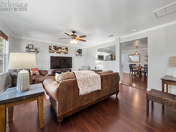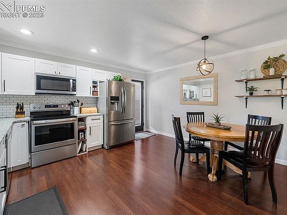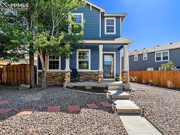 Absolutely gorgeous, fully updated home in a quiet neighborhood with incredible mountain views. Every inch of this home has been updated. The newly remodeled eat-in kitchen has new lighting, custom shelving, new cabinetry, granite counters, stainless-steel sink, & stainless-steel appliances. Half bath on main level has a new water efficient toilet, new faucet, and new custom shelving. Master suite features walk in closet and adjoining, updated bathroom! Upgrades include a new bathtub, custom ceramic tile surround, new shower/tub faucet, new water efficient toilet, new tile flooring, and new double vanity w/ Quartz top and faucets. The bathroom off the loft has a new bathtub, new shower/tub faucet, custom ceramic tile surround, new water efficient toilet, new tile flooring & new vanity with faucet. Interior of the home also features new LVP flooring throughout main level. New paint throughout. New lighting and ceiling fans throughout. New carpet and carpet padding (8#) on stairs & upper level. Crown molding throughout. New whole-house window fan. New whole house water de-scaler/water conditioning system. New 24-30” of blown-in insulation in the attic. Exterior of the home features new paint, new roof, new concrete step off front porch, new concrete patio on north side of house, new Sundance Hot Tub (Model: Marin 880 Series), new front yard fence, sealed all concrete surfaces, new exterior lighting, new kitchen screen door, new drip-line for flower-bed, paving stones, privacy fence for hot tub, added solar lights for sidewalk, added accent solar lighting, new garage door opener with seal, sealed garage floor, new entry door to house, & new stair treads from garage into home. Sit & enjoy the beautiful mountain views, from Cheyenne Mountain to Pikes Peak, from the front porch - One of the best views in the development! The home is across from a 4-acre city park with playgrounds and conveniently located within minutes to Fort Carson & Peterson Space Force Base.