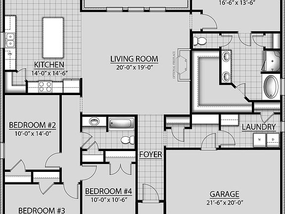 - Open Floor Plan- Four Bedrooms, Two Bathrooms- Two Car Garage- Brick & Stucco Exterior- Recessed Can Lighting in Kitchen & Living Room- Walk-In Pantry- Double Master Vanity- Separate Master Shower