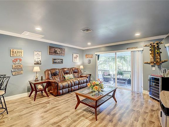 Welcome home to tropical paradise perfected. Exceptional 3/2 CORNER villa, UPDATED throughout. Waterfront property. Foyer entry welcomes you to NEW, plank flooring w/ big baseboards & smooth ceilings adorned w/ crown molding. Wide-open LR is ready for movie night. Entertaining is a breeze in your gorgeous kitchen boasting NEW S/S GE appliances, hand crafted cabinets, granite counters + full glass backsplash. Dining area is perfect for family gatherings. Fall in love w/ the 16'x12' primary suite. Primary bath has a new frameless shower & new vanity w/ QUARTZ countertop. BIG guest rooms w/ ceiling fans. UPGRADED guest bath w/ tub to soak away your stress. Corner BR 3 is a great office. Party on your covered, screened patio w/ SLATE floors or at the bar overlooking the lush gardens. LOW HOA!