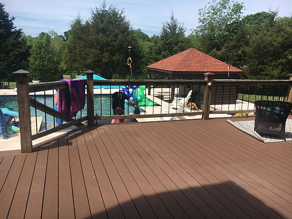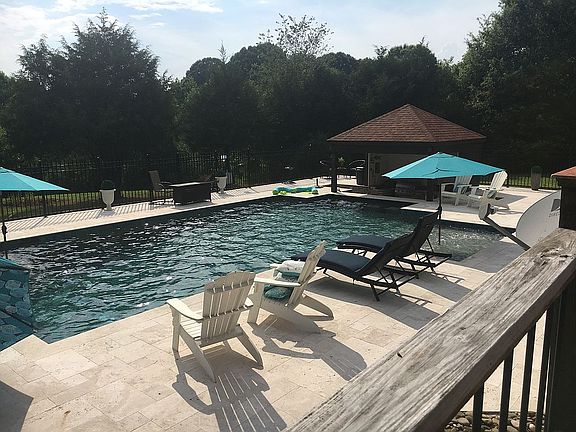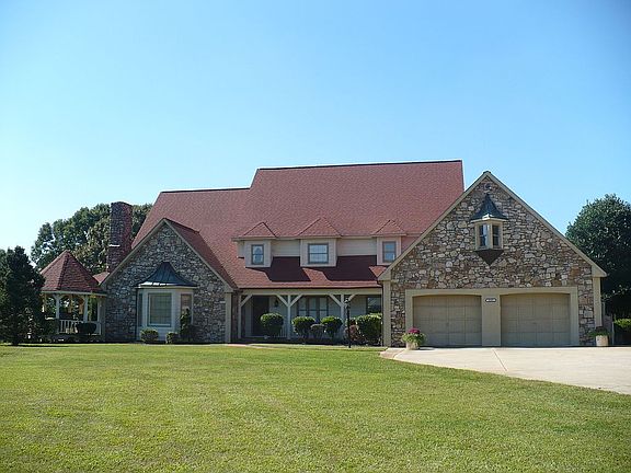 3821 sq ft. stone & hardee siding. Gunite swimming pool with swim up bar and outdoor cabana/kitchen. 1200sq. ft composite decking with gazebo across the back overlooking pool & 12sq. ft brick patio. Separate 800 sq ft guest house with hardwood flooring, floating fireplace, granite countertops in kitchen and full bath. Main Home has hardwood & tile flooring, cathedral ceiling, 2 stone fireplaces, separate bar room. Home has architectural shingles and new replacement windows. Also has separate concrete drive way to the guest house.