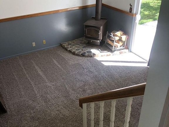 - Flooring- Carpet, Walk-in Closets, Flooring- Linoleum, Window Coverings, Wood Burning Stove, Flooring- Hardwood, Chandelier(s), Curtains/Drapes, Blinds