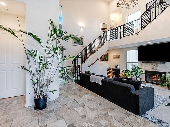 The interior opens up to a living room with soaring ceilings, centered around a fireplace with a travertine surround, and a bar area that promises enchanting evenings. A dramatic wrought-iron staircase ascends to the private quarters, including a master suite that offers a luxurious sanctuary with a spacious tub, separate sitting area or office, a voluminous walk-in closet, and access to a private balcony for moments of quiet contemplation or to bask in the morning's first light.