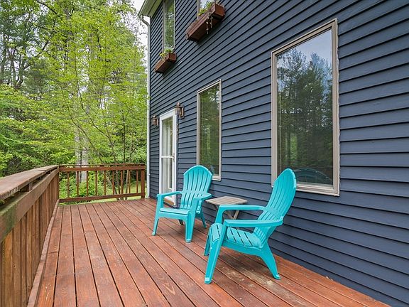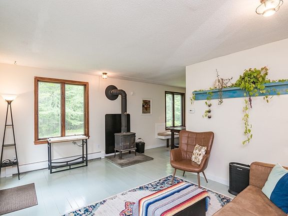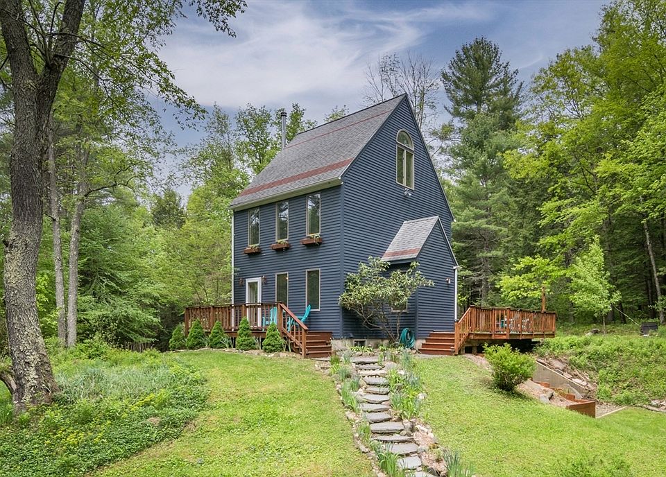 Sun-filled contemporary colonial on 6.7 private acres, including a large 32x24' garage w/high ceilings & 2nd floor studio space! Set back from the road this property includes country chic interiors & delightful outdoor space including plentiful decks, wood-fired hot tub, Goshen stone walkways, perennials, and trails going to the Westfield river & connecting to state land. Inside you will find an open floor plan including kitchen, dining & living rm w/ woodstove & mudroom. Upstairs 2 generous beds & bath, and a delightful 3rd floor bedroom w/ skylights & balcony. You will feel like you're sleeping in a treehouse! The studio space over the garage was built to hold heavy machinery & has big windows & track lighting, perfect for an art studio or workshop space, and currently used as summer-time sleep loft. A wonderful country home, in a convenient location only 3 min. to the Old Creamery or 25 min. to Northampton.