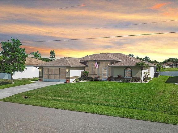 Gorgeous lakefront pool home with 3 bedrooms 2 1/2 baths and over 2,100 sq. ft. of air conditioning living space. The spring fed lake is perfect for birdwatching along with other wildlife, fishing , kayaking and Florida's breathtaking sunsets. As you drive up one can't help but notice the beautiful curb appeal with attractive front entryway and lovely screened in porch. The home has a desirable split floor plan with a separate living room, family room, formal dining room and open kitchen with breakfast bar and separate breakfast nook overlooking the pool lanai and lake. The spacious kitchen is bright and open featuring hard surface counters, deep double kitchen sink, and new stainless steel Maytag kitchen appliances. The family room has built in entertainment center and a large bay window for more glorious views of the lake with sliding glass doors throughout opening up to the pool area. The huge master bedroom features a walk in closet, Master bath has double sinks as well a jetted garden tub. Master Bedroom also has Sliding glass doors which open onto the pool area for easy access and more breathtaking views. The additional two other bedrooms are on the opposite side of the house with a separate quest bath for additional privacy. Extra features include a deep 160 foot well with new well pump 2019, freshly repainted exterior, replaced master shower with new fixtures, new tile and glass shower door, new Rheem 50 gallon water heater replaced in 2019, an extra 8 foot tall garage door with built in work bench and plenty of shelving, accordion shutters across the lanai and steel hurricane shutters for remainder of home. The lanai and pool area have been refinished with pebble tech for easy maintenance. The volleyball style swimming pool is heated with a new Gulf Stream heat pump for swimming year round. Home is in a great location NOT IN A FLOOD ZONE, Quiet neighborhood yet close to all the amenities 1-75,restaurants, shopping, boating, beaches, golf courses and historic downtown Punta Gorda all within minutes. This home is a must see with spectacular views throughout! Call today!