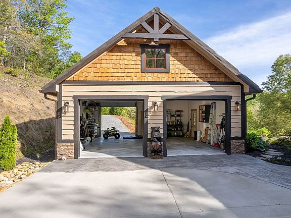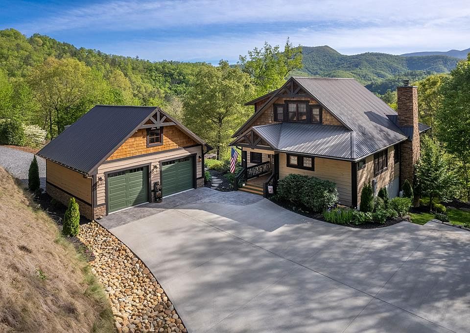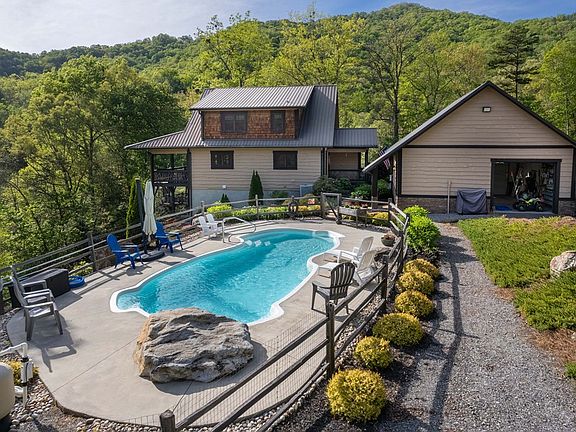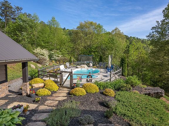 This captivating custom mountain residence, boasts 3 bedrooms, 3 full and 2 half baths, on a picturesque 6.6-acres with mountain views. Embrace the tranquility of your own mountain sanctuary, where you can unwind by the inviting in-ground pool or gather around the fire pit, soaking in the summer melodies of the Great Smoky Mountains. The full-length upper deck, provides breathtaking views of the peaks or down in the yard find a private free-standing deck with 2 exhilarating zip lines accessible via a well-maintained patio adorned with a charming stepping stone trail. The main floor offers an ideal setting for hosting gatherings, featuring a spacious remodeled kitchen with exquisite Brazilian quartz countertops, alongside dining and living areas complemented by a cozy wood-burning fireplace. The primary bedroom, conveniently located on this level, ensures easy retreat after entertaining guests. Descend to the fully finished basement, comprising a second bedroom and full bath, with a cozy gas fireplace, additional half bath, wet bar, and ample storage space. Ascend to the loft, where you'll discover additional living space, closets, a versatile office area, and a third full bath.