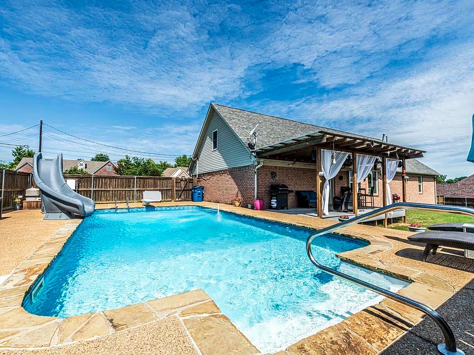 POOL! Beautiful home on corner lot. 3 bedroom 2 bath and office down. Plantation shutters downstairs. 1 bedroom, 1 bath, bonus room, and storage closet/2nd office up. Wonderful back covered-patio that leads to a Salt-water inground pool with diving board and slide. Garage has patio screen and door that comes down when the doors are up.