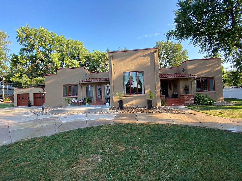 Awesome and unique ranch style home with original hardwood floors with over 1893 sq ft on main level with 3 BR, 2 baths and partial finished walk out basement. Family room in basement could also be used as a 4th bedroom with the walk out door. Newer larger double pane custom windows installed by Cardinal Construction in approx 2014. Newer roof installed (east side in 2019 and west side in 2020). This beautiful stucco home with attached 2 car garage is located on a cul-de-sac on east 9th street close to a college and park. Lots of updates. High ceilings with wood beams and wood burning fireplace. Lots of storage, butler's pantry, main floor laundry, alley access. Possible large bedroom in basement with walk out door. Lots more to see. Lots and lots of charm!! Move in ready!! Appliances included.