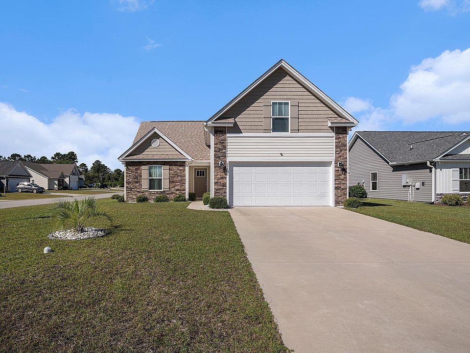 Located on a desirable corner lot, this 4-bedroom, 3-bath home offers a spacious layout with modern finishes. The main living area features LVP flooring, while the kitchen, bathrooms, and dining area are finished with tile; bedrooms are carpeted for comfort. Cathedral ceilings enhance the living room and first-floor bedrooms, creating an open, airy feel. The kitchen is equipped with granite countertops, ample cabinetry, and stainless steel appliances. Enjoy outdoor living on the large covered back porch, with a fully irrigated yard for easy maintenance. Additional features include TAEXX pest control tubing. Ideal as a primary residence, vacation getaway, or investment property.  Red Hill Commons offers a convenient location near CCU, Conway Medical Center, shopping, dining, entertainment, and just a short drive to the beach.