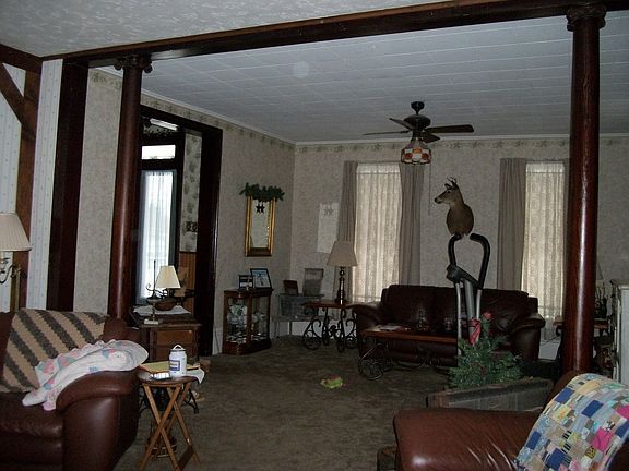 #1652 ~ SPACIOUS COLONIAL HOME 2550 sq. ft., 3BR, 1 bath, large rooms, LR w/fireplace, 2 staircases, full bsmt, cozy front porch, over-sized 2 car det. garage, shared paved drive, local businesses, schools, & park close by. $145,000