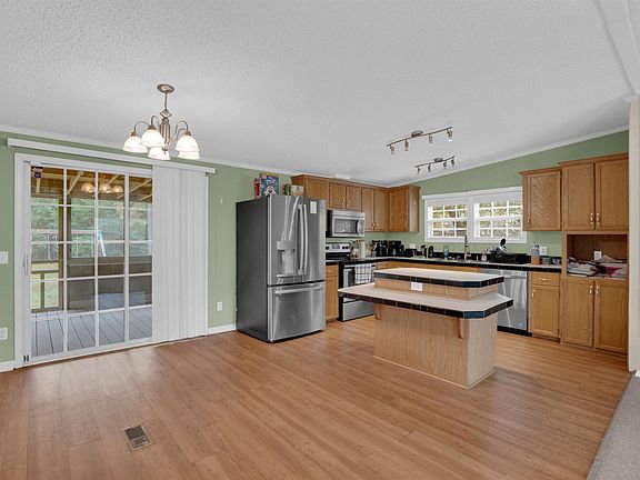 - Features: Cabinets-Natural, Kitchen Island, Counter Tops-Formica, Floors-Laminate, Backsplash-Tiled