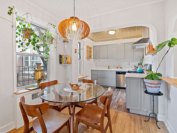 Apartment #602 presents a spacious two-bedroom, one-bathroom co-op for sale in Brooklyn and provides a layout with generous living and entertaining space. This home is adorned with custom features and boasts distinct architectural elements, including custom closets and arched doorways. The oversized kitchen provides an abundance of dining room space, making it perfect for hosting gatherings. The kitchen seamlessly transitions to a large living room, featuring a custom home office area and a tremendous seating space. Picture yourself enjoying breathtaking sunsets from the comfort of your sofa, as natural light floods in through the North West-facing windows.