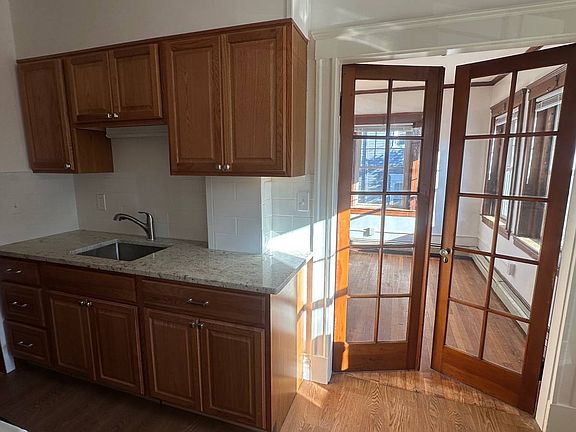 Rear porchEat in kitchenGleaming one bedroomPlenty of cabinetsGlass french doorsVanished natural wood floorsGreat kitchen