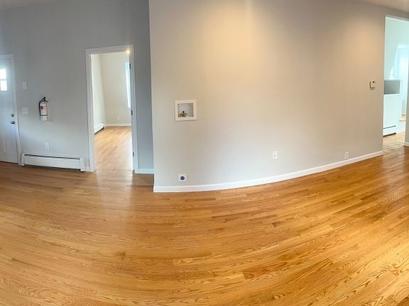 Beautifully renovated in 2021, this second floor apartment boasts 3 bdrms and 1 full bth. Landlord has freshly painted the entire apartment and it has been professionally cleaned. Lovely, hardwood floors throughout create a warm, inviting environment in all of the rooms and hallways. The kitchen area is updated and has a newer refrigerator, electric range oven and microwave. The kitchen space is actually part of the large living area which boasts spacious, vaulted ceilings. No cooling but tenant may use their own window AC units. Tenant pays water, electric, gas and sewer and is responsible for snow removal and lawn maintenance of their own area. Garbage is included in rent. Hookups available for laundry. Rent includes one parking space.