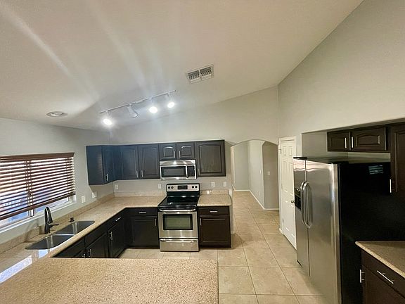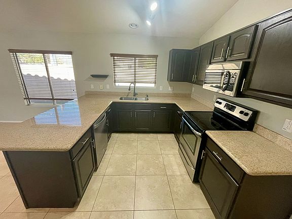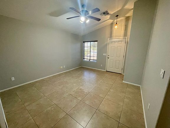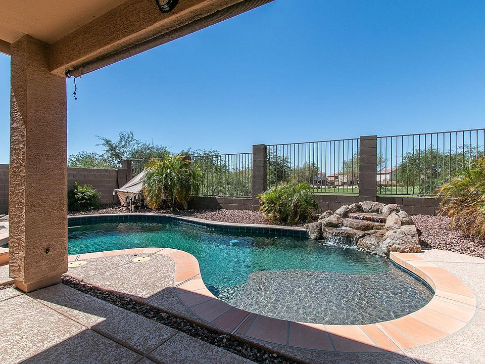 Golf Course Lot & Private Pool Great backyard entertainment home with pebble tech pool backs up to the golf course and has great mountain views. This home has high vaulted ceilings, ceiling fans in all living areas and bedrooms and lots of natural light making this 3 bedroom 2 bath home seem larger than 1238 SqFt. Large tile flooring flows through the living spaces and bathrooms with wood look flooring in all bedrooms. Open floor plan with a great room open to the kitchen and a room in front perfect for formal dining or a home office. The kitchen has dark oak cabinetry, tons of storage, granite countertops, stainless appliances, pantry & breakfast bar. Sliding doors lead out from the great room to the covered patio, a private pool with rock waterfall, view fencing to capture those golf & mountain views, and a fenced side yard with a paver patio & artificial turf. The master bedroom has wood look flooring, two closets and a private bath with tub/shower combo. Community features golf course, playground, basketball court, covered Ramada with BBQ grill and picnic table and lots of grassy areas. Contact Mary today! Sorry no pets Tenant pays all utilities. No Smoking Park in Garage or driveway only. Rent: $1795 Security Deposit $1795 Admin/Move in Fee $250 No Pets