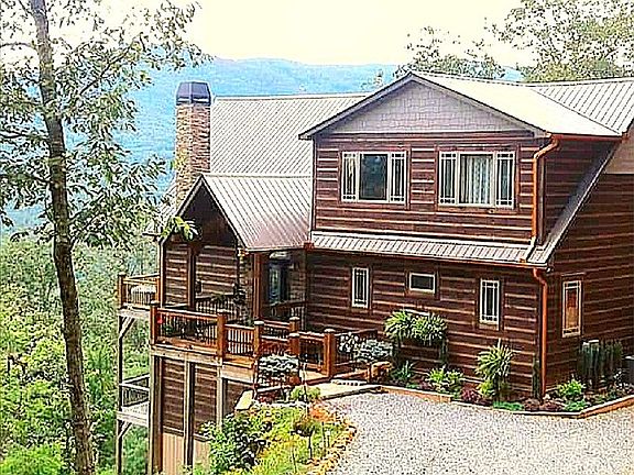 Prow Front Mountain Top Chalet w/ Thermo Glass Windows (24 ft. high X 30 ft. wide), on 2 Acre Secluded Wooded Lot. T&G Wood Ceilings w/ Timber Frame Beams in Great Room & Kitchen. "Master Suite" on Main Level w/Heated Master Bath Floors, Large roll in Shower. Travertine Stone Floors from Foyer, thru Kitchen, Laundry Rm, Pantry & 1/2 Bath. Living Room has Large Napolean LP Fireplace w/ Remote for Flame, Lighting & Heat. Main Level Large Coverd Deck w/ Massive Stacked Stone SS Wood Fireplace. Upper Level Loft has "Office & Guest-on-Suite" w/ Separate Trane A/C & Heat. Lower level 3rd Bedroom Private Deck & Full Bath, Game Room Bar, Pool Table, Dart Board & Huge 150 inch Movie Screen w/ 4k Projector. Lower Level also has Utillity Room w/ 2nd Refrig., Work Shop & Large Storage Areas. Included: Floorplan Design for Potential 2 Bedroom Apartment, Airbb, etc., Private Deck already installed.