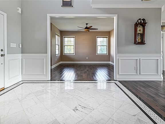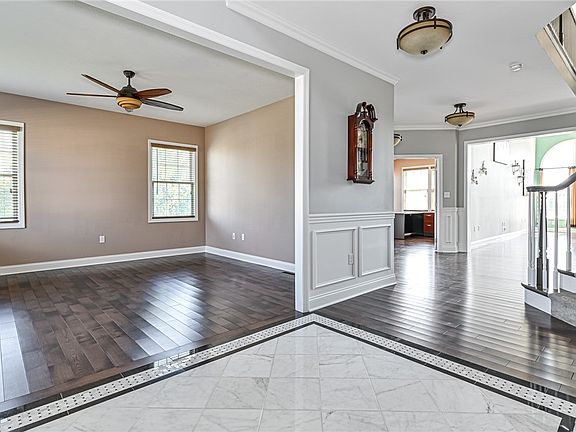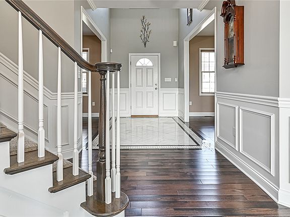 Welcome to this exquisite Provincial-style home situated on the cul-de-sac, offering luxurious features and elegant design throughout. As you enter, the grandeur of marble and hickory hardwood floors highlight the first floor. The formal living room provides a serene space for relaxation. The oversized den with French doors is perfect for working from home. The dining room sets the stage for memorable gatherings. The gourmet kitchen is a culinary masterpiece, featuring an extra-large center island, Quartz countertops, tile backsplash, stainless steel appliances, and an adjacent Morning room with cathedral ceilings. The heart of the home lies in the 2-story Great room with custom stone gas fireplace. Upstairs you'll find a generously sized Owner's suite with lavish bath offering marble floors, jet tub, and tiled glass shower.The remaining bedrooms offer a private suite and Jack and Jill bath.Outside,a large patio awaits overlooking a table-top level yard perfect for outdoor activities