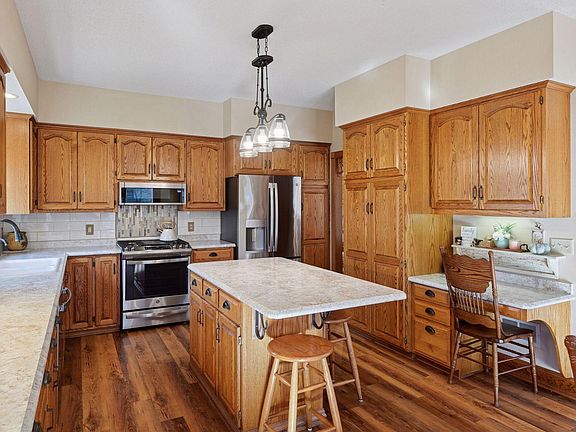 Welcome to this charming split-level home. This lovely residence features 4 spacious bedrooms and two full baths perfect for accommodating family and friends. As you step inside you will be greeted by an inviting living area, a formal dining room, and a chefs kitchen. This home offers a sense pf privacy with the primary bedroom up and the 3 additional bedrooms on the lower level. There is an additional living space on the lower level as well to complete this home. The three season porch is a great spot to enjoy those spring and summer evenings. One of the standout features of this home is the large beautifully landscaped backyard. With plenty of room to play and entertain your guests this is the perfect oasis for summer barbecues with the creek running through the back. The home also includes a 4 car garage providing ample space for vehicles, storage, and even a workshop for your hobbies! Furnace, central air, water softener, washer, dryer, and stainless steel appliances are all newer.