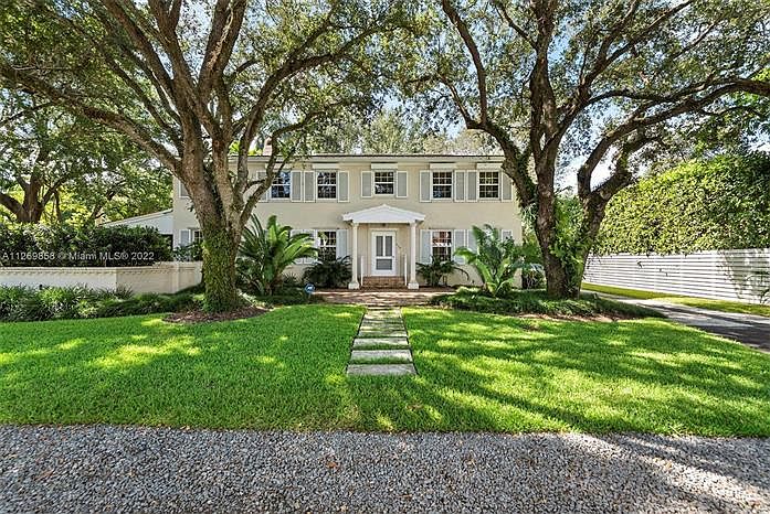 Live the Grove lifestyle w/the luxury of Gables services in this lovely, extensively remodeled/enlarged family home. Sitting atop a limestone ridge 21' above sea level, its Caribbean-Colonial style exudes charm & easy living w vast, wrap-around covered porches perfect for coffee or cocktails. Designed by an owner/architect, updates include impact windows/doors & full house generator. Interior features include 3 en suite bdrms (primary boasts His&Hers baths & closets), formal living & dining rms, eat-in kitchen, 2 family rms, lge library/office & wood-burning fireplace. Classic breezeway connects to a 2.5 car-garage designed for an easy conversion to guest quarters, artist's studio or gym. A lush Raymond Jungles landscape/hardscape distinguishes this gracious residence. Welcome home!