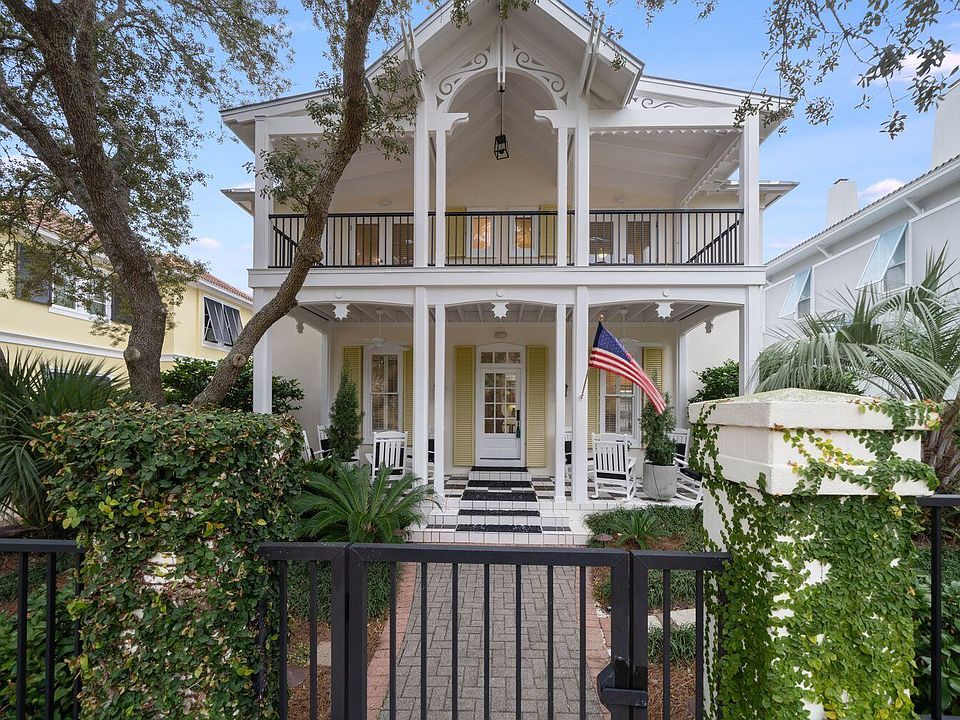 Under contract with 72 hour kick-out clause - Discover this meticulously maintained and furnished Caribbean-inspired residence nestled within the secure confines of the Caribe gated neighborhood. Upon arrival, a sprawling front porch extends a warm welcome, setting the tone for the inviting atmosphere within. Step inside to experience an open design where the living area boasts a gas fireplace, and the well-appointed kitchen showcases stainless steel appliances, a gas stove, and a convenient trash compactor.The first floor reveals additional amenities, including a powder room and the primary bedroom, granting access to a charming side deck adorned with a pergola. The primary bath exudes luxury with double sinks and a tiled shower. Ascend to the second floor to encounter two generously sized bedrooms, each with access to a balcony overlooking Rue Caribe. These bedrooms share a Jack & Jill bath featuring double sinks.