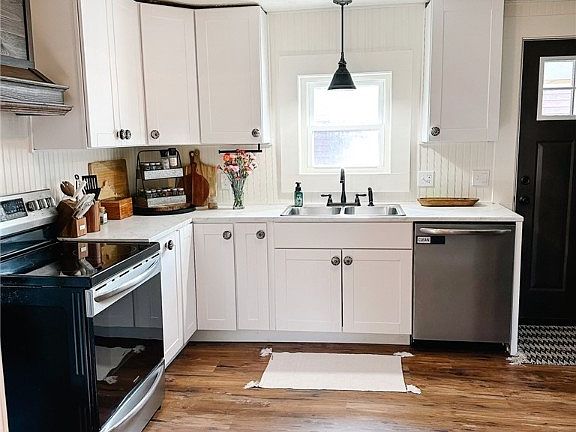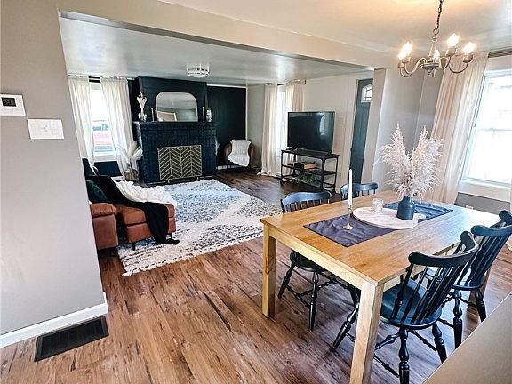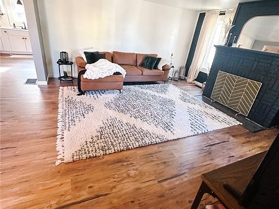 Dark accent wall combined with a brick fireplace, rustic hardwood flooring throughout, faux covered range, and stone-looking countertops are just the start of the updated features!