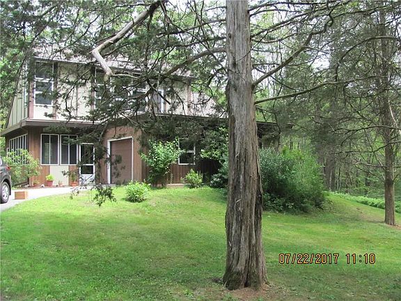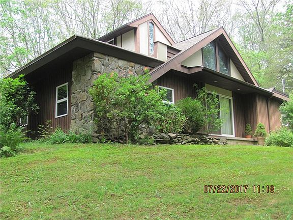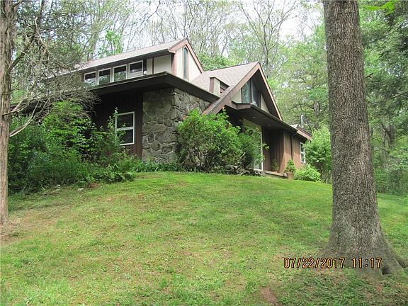 Secluded unique Contemporary feels like a "Swiss Chalet". This home is nestled in the woods with complete privacy. The living room faces the from floor to ceiling windows with beautiful views, and a stunning rock fireplace for those winter evenings. The first floor master bedroom is an added plus for easy living. The second floor bedroom is accessed by a winding staircase which opens up to a large bedroom with a balcony overlooking the living room and the floor to ceiling windows which also provides a magnificent view. There is also an access to what used to be a penthouse balcony above the garage. Easy access to Route 2 and Hartford.