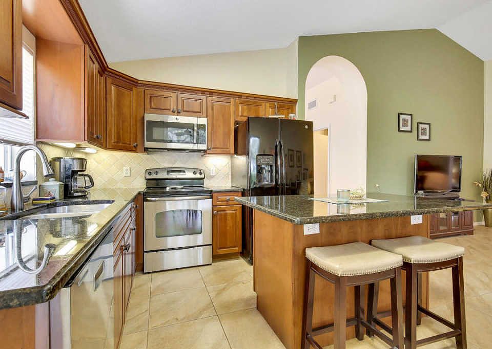 Move Right In to this beautifully updated home...Gorgeous kitchen with cherry cabinets, granite countertops & a spacious center island! Both baths are updated, and there's neutral colored tile flooring throughout, plantation shutters in addition to accordion hurricane shutters, new wood & beveled glass entry door. Screened/Covered back patio overlooks nice sized backyard-uniquely situated on a private lot with no rear facing neighbors. HOA includes lawn care, premium cable, (and soon internet). River Bridge is an ALL AGES, PET FRIENDLY resort community where you can live the country club lifestyle WITHOUT country club fees! Residents enjoy 2 public pools, kiddie pool, clubhouse activities, spa, tennis courts, tot-lot, and so much more--SEE SUPPLEMENT for more community details!!!!