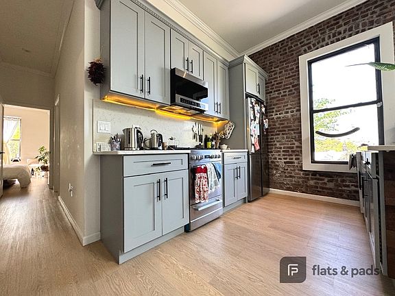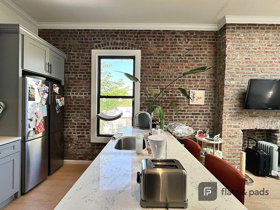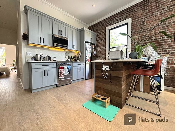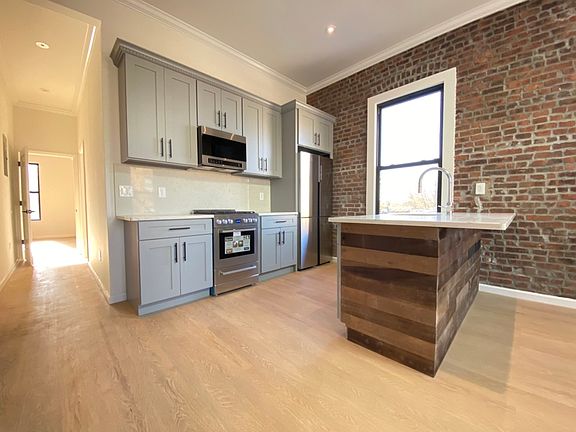 Newly gut renovated, entire 3rd floor 3-bedroom / 2-full bathroom rental with luxury condo finishes, featuring: In-Unit Bosch Washer/Dryer Huge living room w/skylight Luxury stainless steel appliance package Island kitchen with white carrara quartz countertops and white shaker cabinets 3-Zone Heat & AC (Separately controlled, each bedroom and living room) 1-king size+ bedroom with dual exposures, Walk-In closet and En-Suite bathroom 1-queen size+ bedroom w/double door sliding closets 1-full size bedroom w/double door sliding closet Sliding double door hallway closet Floor-thru unit w/lots of windows throughout Recessed LED lighting throughout Crown and baseboard molding Luxury fully tiled bathrooms (1-soaking tub/1-shower stall) Video intercom system Exposed brick Super high ceilings Excellent location 2 short blocks from the 3, 4 trains at Eastern Parkway and 8 blocks from the A, C train at Fulton St. Just 30 minutes to Manhattan! Close to Prospect Park! Guarantors accepted & welcomed!! Pets allowed upon approval!!