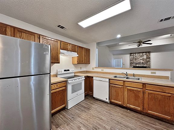 Nestled beneath a massive shade tree, this adorable home offers fresh paint and new flooring throughout. The inviting living room features a cozy brick fireplace, vaulted ceilings, and a ceiling fan for added comfort. The open kitchen comes fully equipped with a stove, refrigerator, dishwasher, garbage disposal, and a convenient breakfast bar. A bright dining area overlooks the enclosed side patio, perfect for morning coffee or evening relaxation. Both bedrooms are generously sized and include ceiling fans and walk-in closets. You'll love the full-sized utility area, central heat & air (CH&A), and the fenced backyard with an open patio—ideal for entertaining or pets. Too many great features to list—schedule your tour today!