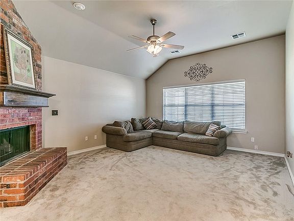 Relax on either of the two spacious covered front or back porches on this craftsman styled home. Perfect for first time homeowner, retired couple or investor, this home lives larger than its 1405 square feet with its open living room/kitchen/dining area. A brick fireplace & large windows create an inviting atmosphere in the living area which is separated from the adjoining dining/kitchen area only by a couple of arches. Granite-look counters and dark stained cabinets plus ceramic tile floors and a small island appoint the kitchen. Just off the kitchen/dining area is a large covered back patio leading into a fully fenced backyard offering a fenced dog area as well. (Hot tub can stay or seller will remove---buyer's choice) Spacious master with walk-in closet, double vanities and separate tub & shower. With neutral paint and carpeting ready to move right in. The well-maintained home also has a home security system & is Located in the sought after Cashion School District.