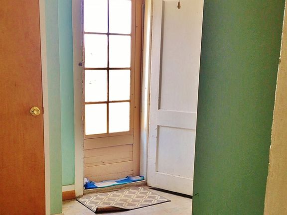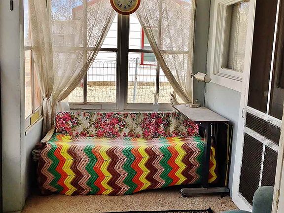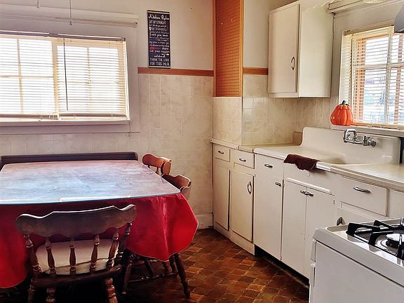 Cute bungalow with roomy eat-in kitchen. Enclosed front porch area on front of house. Two stall garage plus more storage areas!