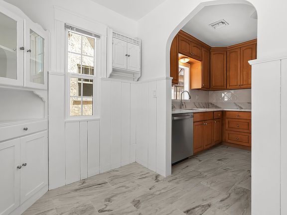 Refreshed kitchen: new counters, flooring, and appliances with original wood cabinetry