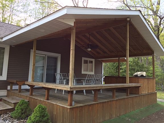 TERMS AVAILABLE! Year Round Home/Cabin 150' x 100' Lot size 1,030 Sq. Ft. Ranch home 620 Sq Ft two car attached garage (insulated & dry walled) 936 Sq Ft detached garage 36' x 26' x 10' 320 Sq Ft Covered deck w/grilling area w/counters & storage 18' 4" x 20' Living room w/cathedral ceiling 12' x 12' Master bedroom 9' x 2' Master closet 11' x 11' 5" 2nd bedroom 8' 6" x 2' 2nd bedroom closet 16' 4" x 11' Kitchen/Dinning room Kitchen island/snack bar with granite top 2' x 2' Kitchen pantry 5' x 9' Bathroom 2" x 6" Exterior walls Andersen windows Very well insulated walls and ceiling Hickory kitchen cabinets Granite counters in kitchen Kitchen appliances Wood burning fireplace w/stone wall to ceiling New roofing on home 2014 New detached garage 2014 New vinyl siding and soffit 2014 Kitchen remodeled 2014 Bathroom remodeled 2013 Detached garage 10' ceiling height (18'x8' overhead door) Attic storage in detached garage Two skylights in kitchen Two blocks from Elm st community dock / beach Non-homestead property taxes $1,931.00 Additional sleeping space in finished garage
