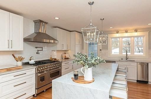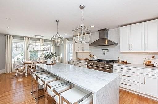 There is no way to describe this property other than simply gorgeous. The gourmet kitchen is a chef's dream (fully renovated 2020) w top of the line Kitchen-Aid appliances & 4 Ft wide ZLine 7 burner stove & hood. 8 Ft Long Carrera Marble Waterfall island. Wide Deep Basin Sink. Subway Tile backsplash & Carrera Marble countertops. No detail left undone. The kitchen opens to a pretty dining room. Recessed lighting & beautiful pendant lighting throughout. The open floorpan extends into the living room w fireplace, sunroom/office, and archway hallway leading upstairs. Two fully renovated baths w tiled flooring and upgraded everything. 3 bedrooms upstairs w hardwood flooring & fresh coat of paint. Huge master suite for you to retreat to after a long day. There is a walkup attic w heat/ac just waiting to be finished - turn this space into a 4th bedroom, office or den space. Outside find a beautiful inground pool w shed/cabana & massive 4 car garage (1000SF). Newer roof/windows & mechanicals.