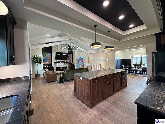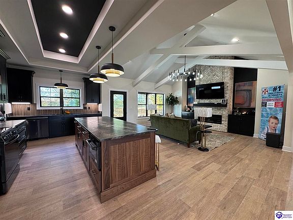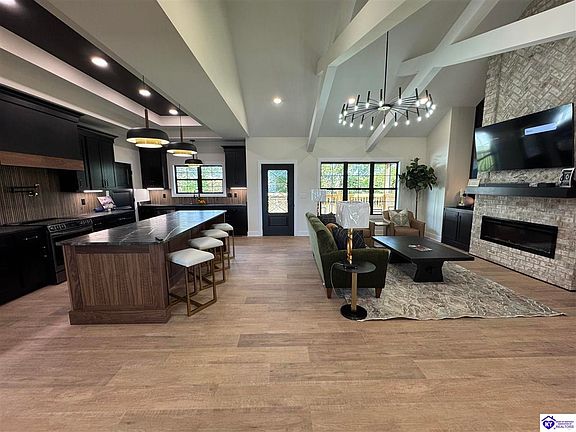 Welcome to a home that defies the conventional, a showpiece in the Lincoln Trail Home Builders Association's Parade of Homes designed with a sophisticated, moody aesthetic. The kitchen is a chef's dream, centered around a huge, oversized island with dark, elegant cabinetry and a luxurious countertop. This space is a functional hub for entertaining and everyday living. A spacious walk-in pantry offers concealed storage to maintain the home’s clean and sophisticated aesthetic. The private primary suite is a true sanctuary. Its spa-like bathroom features a large, beautifully tiled walk-in shower with a frameless glass enclosure and a separate soaker tub, perfect for unwinding after a long day. The dark, modern fixtures and high-end finishes create a feeling of opulence and tranquility. This home is a masterpiece of local craftsmanship, blending timeless materials with a modern, dramatic design to create a space that is both stylish and profoundly welcoming.