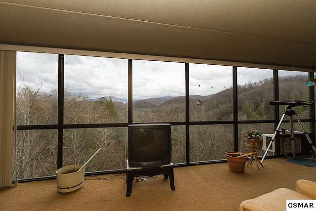 INCREDIBLE VIEWS OF MOUNT LECONTE & THE SMOKY MOUNTAINS FROM SUNROOM in this permanent 3 bedroom / 2 bath resident condo (one of the best in the complex). Has large sunroom with a wall of windows to let you take them all in. Spacious living room with masonry gas fireplace and exposed beam ceiling. Include a walk-out patio with only two have in the building. You can tell that it was designed to live in permanently because of all the storage space - closets everywhere with 2 large walk-ins as well as a storage room just outside the unit. Complex has pool and assigned covered parking. Very convenient location - near library, community center, Gatlinburg, Crafts Community and all the shopping, everything with no steep hills to climb.