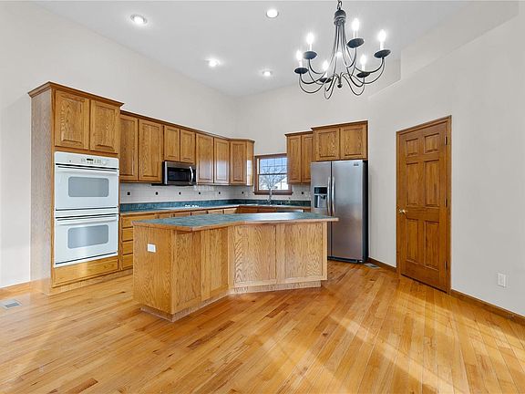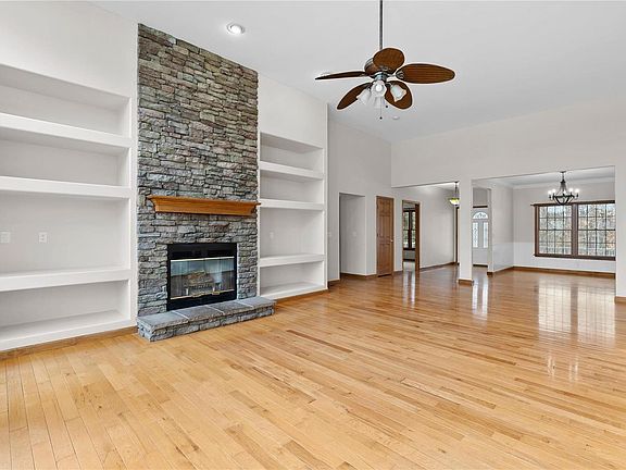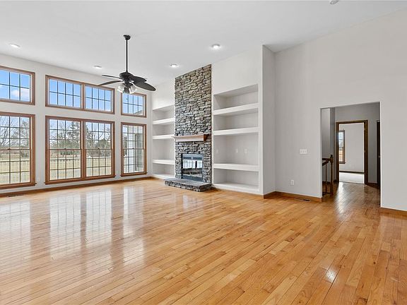 This spacious ranch on 3 acres backs to St Charles County’s newest park, Oglesby Park, with 200 acres of walking trails, lakes, restrooms, playgrounds and more. 4375 sq ft of finished living space with fresh paint and flooring, 4 bedrooms, 3.5 baths and 9’ and 12’ ceilings throughout. This kitchen has a center island, custom cabinets, double wall ovens, hardwood floors, walk in pantry and a breakfast area that opens to the three-season room. Stunning great room with 12’ ceilings, built ins and a floor to ceiling wood burning fireplace. The lower level is complete with a bedroom, a full bath, a rec room, and a spacious family room. The outbuilding is 29’x19’ with a tall door to accommodate camper/rv storage with a covered porch overlooking pond. One owner home offering amazing space, room to run, and Wentzville’s newest schools!