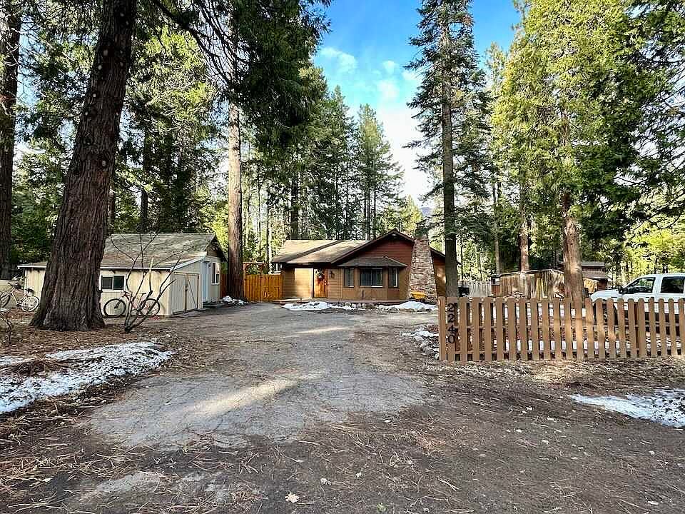 Charming cabin style home located minutes from downtown Mt Shasta. Home is a single level, split floor-plan, three bedrooms and one bathroom with a tub/shower combo. Home has a huge pantry room, cozy warm fireplace insert in living room with large mantle. New trex deck at the front entrance, a slider door exits the primary bedroom to a fenced and gated back yard with room for gardens and fur-babies. There is a small horse coral, shelter / wood shed and outbuilding. The one car garage is used for storage, it has a new roof and siding and was at one time a smaller cottage.