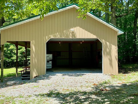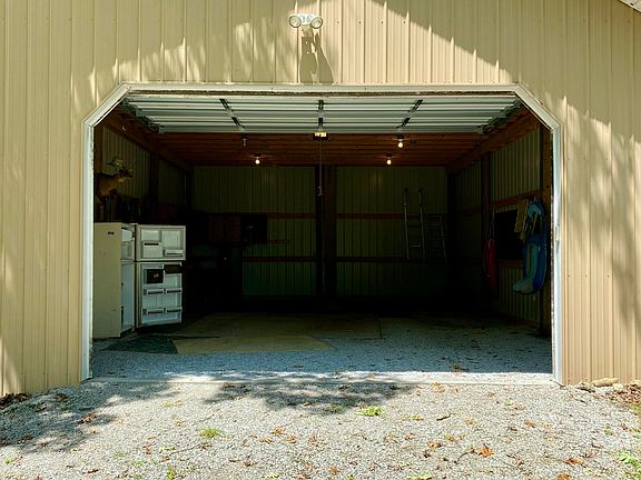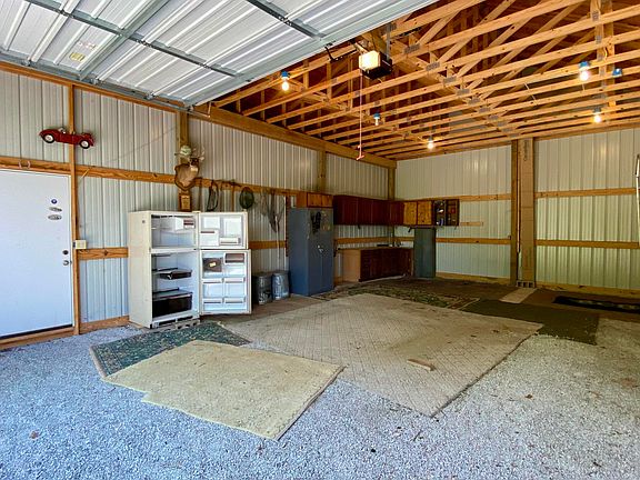 A massive 32x34 detached garage (built in 2014) with gravel floor, 10-ft tall door, 240V panel with 30 amps, fridge, cabinets, and a great workshop space. There's even a lean-to off the side with a 110 outlet. Perfect vacation spot or fishing cabin with storage for your boat!