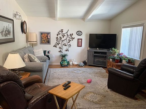Such a quaint and comfortable cozy home! It's charming with open beamed wood ceilings, white cabinetry and beautifully tiled walls in the kitchen. Original oak flooring is throughout the living and bedrooms with tile in the kitchen and laminate in the bathroom. It's been tastefully remodeled, including the electrical panel, there's solar, a tankless water heater, all appliances stay and there's even a nice hot tub in the rear secluded back yard so you can relax and have a nice soak under the stars! The garage has been partially converted and has a wall HVAC unit which makes a great office, reading room, or to tuck away your overnight company! They have also just recently insulated all the walls and repainted!! The driveway even fits an RV. It's the perfect little home in this quaint little town!