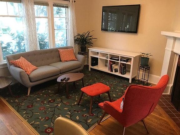 Price listed is as a furnished apartment. Open to renting as partially furnished or unfurnished. -Hardwood floors throughout -Wood-burning fireplace -1000 square feet of living space -Private Deck attached to one bedroom -Recently updated -Laundry in building -Large Private Storage in Basement (No Extra Charge!) -Ample street parking -Shared backyard, great for BBQs -Owned and managed by neighborhood family -Excellent neighborhood, across the street from Irvington School (with playground and park); in Grant High School district -Near shopping (Safeway, Whole Foods, New Seasons), Lloyd Center Mall, shops on Broadway -Great restaurants/bars within short walk: Swift Lounge, Blossoming Lotus, Petisco, Hop House -Public transit (MAX, streetcar, bus) all within walking distance -No dogs or cats; will consider small pet -$1000 security deposit (w/Very Good Credit); larger deposit with lower credit score -6 month or 1 year lease Tenant pays for electricity.