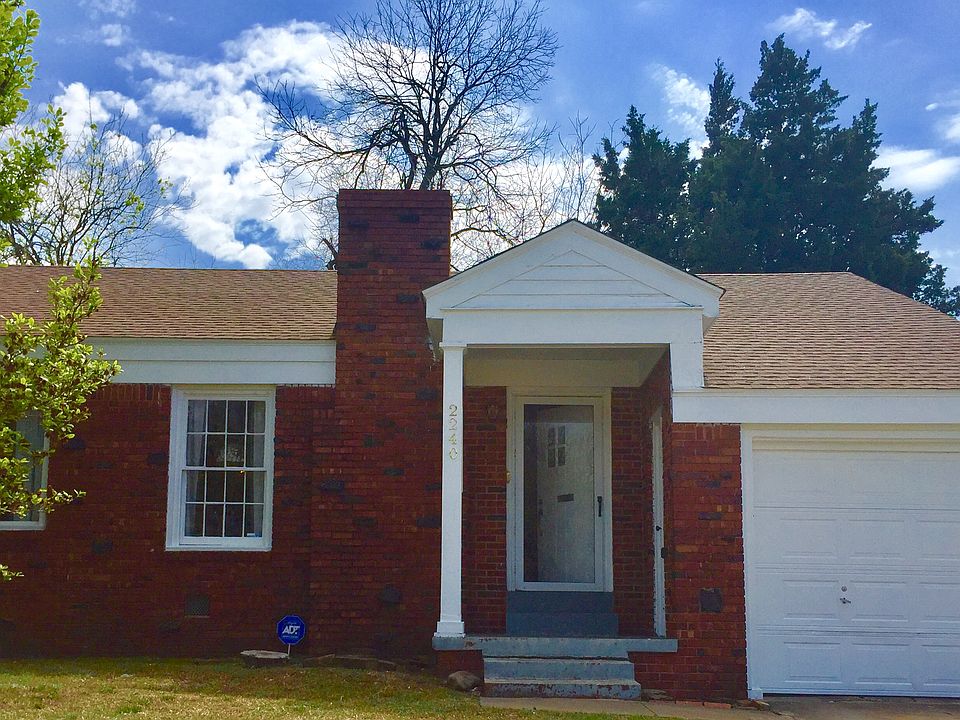 This one-story, brick Minimal Traditional house has a side gabled composition roof and a front gabled porch. An incorporated garage is located on the right front; to its left is the porch/entry, and farther left is an elaborately designed front-facing chimney, two large picture windows with the south facing window incorporating two, smaller paired windows. The porch is supported by a square, wood column.