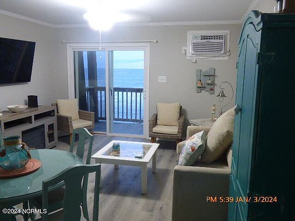 If you hurry you can get your own point unit condo on the ocean in the North Topsail Beach Topsail Reef complex. The unit was remodeled in 2019 and offers a rare open floor plan that has a larger kitchen/living room space than typical units. You will find that the Topsail Reef complex has some of the most economical units anywhere on the island, if not the east coast. These one bedroom units are sought after as vacation or rental units. Picture yourself sitting on the deck watching the dolphins play, relaxing on the beach, playing in the ocean, surfing, or perhaps reeling in the big one surf fishing. Cable, internet, water, sewer, trash pickup, and building insurance are some of the items provide by the Topsail Reef HOA. On top of all this, the unit is furnished.