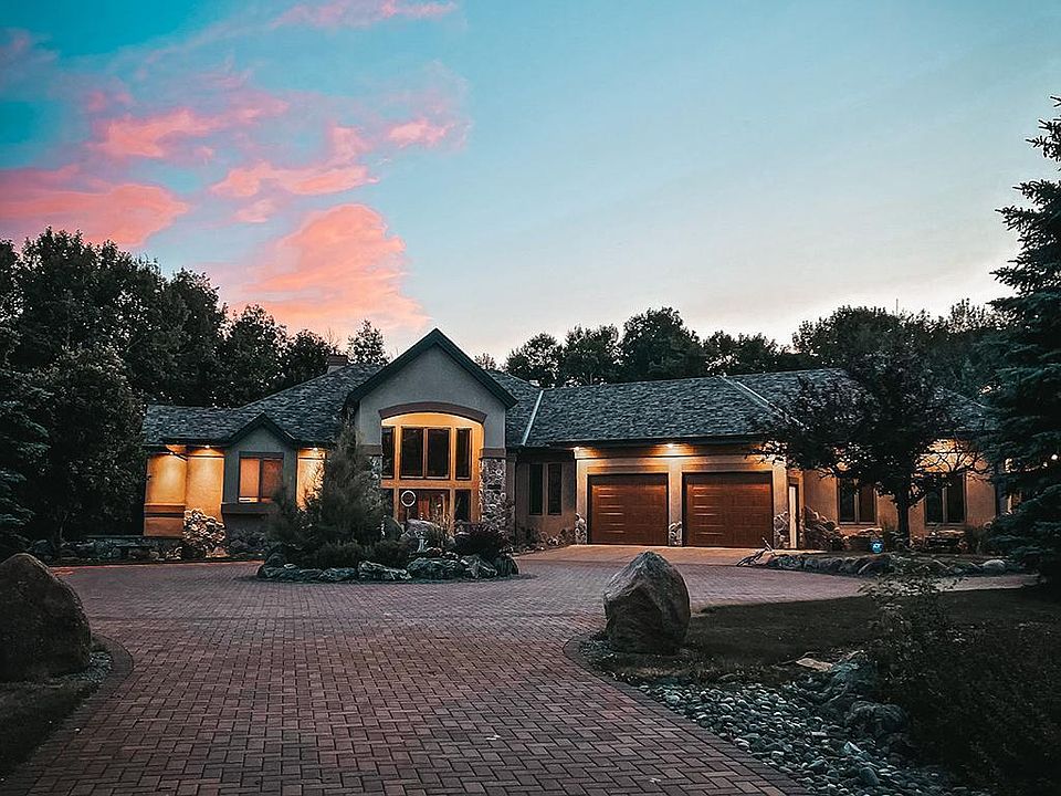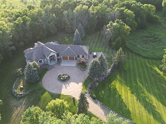 Unparalleled luxury in this custom-built estate privately nestled on 10 wooded acres with a luscious, irrigated lawn. After walking in the grand entrance, you are greeted with a sprawling great room or walk downstairs and enjoy a drink at your wet bar complete with Sub-Zero wine fridge & dishwasher. Boasting 4 bedrooms, each with walk-in closet this home merges elegance with comfort. Master suite features a deck, marble bathroom with a dual-head shower, and jacuzzi tub overlooking a picturesque pond. A large open concept kitchen that would make a chef’s wildest dreams come true. This kitchen is fully furnished with hickory cabinets, granite countertops, top-of-the-line Sub-Zero & Wolf appliances and a spacious pantry. This home was built with energy efficacy in mind with spray foam insulation throughout and in-floor heat in basement & garage all powered by geothermal. The property includes a nearly 5,000 sq ft heated pole building perfect for hobbies or a business. A must-see estate!